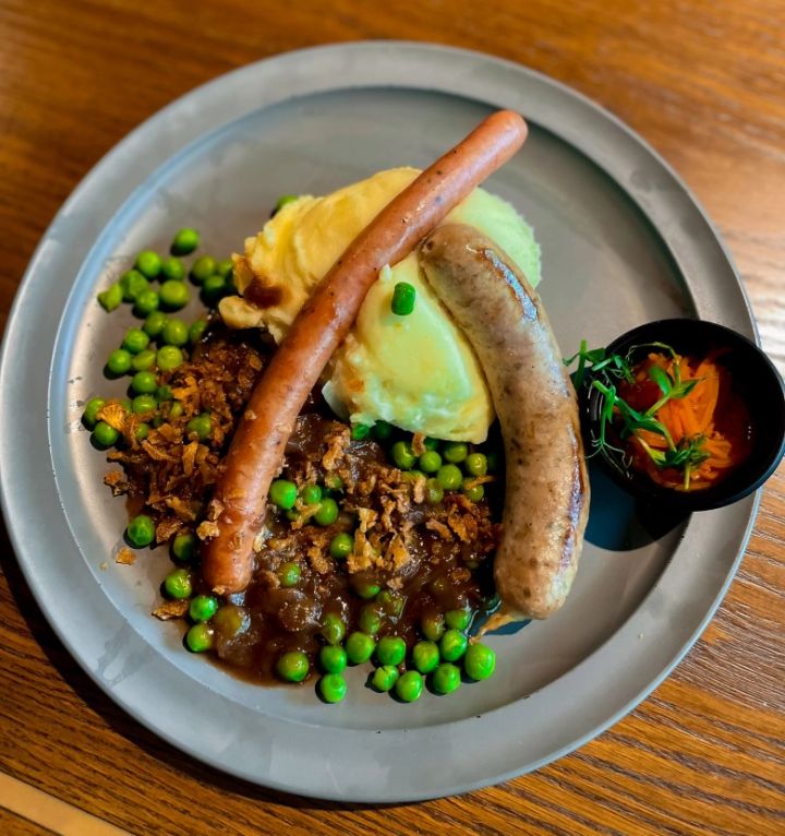 伝統的なイギリス料理のひとつ。マッシュポテトの上にこんがり焼いたソーセージがオン。マッシュポテトが大好物なので、次回も必ずこれを注文します!バンガーズ&マッシュ¥1,800