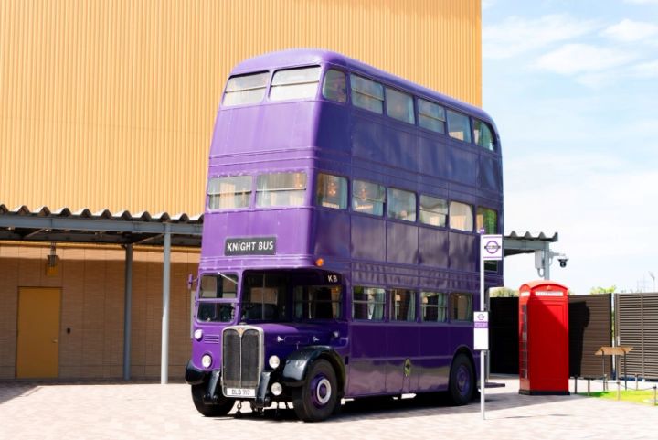 『ハリー・ポッターとアズガバンの囚人』で登場した夜の騎士バス。どんな狭い所も通り抜け、猛スピードで移動するバスは、ロンドンの2階建てバス3台分のパーツを繋ぎ合わせているそう。