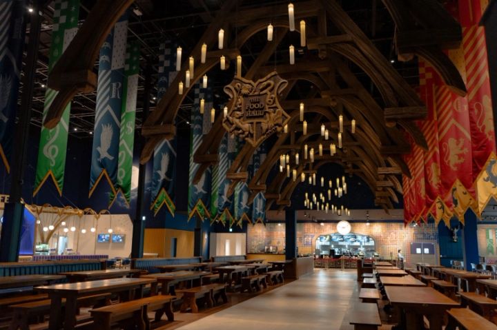 英国風のメニューが充実しているフードホールは、冒頭で紹介した「フロッグカフェ」の横にあります。こちらはホグワーツ魔法魔術学校の大広間をイメージした空間。天井が高く、その壮大な空間を彩っているのが物語に登場する4つの寮を示す色のタペストリー。映画同様にキャンドルも高く浮いていて、ここに座るだけでもテンション爆上がりです!