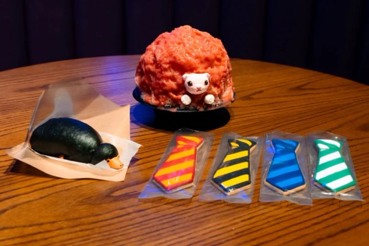 ここではカラフルなデザートがショーケースを飾っていました!新作デザートには映画『ファンタスティック・ビースト』シリーズに登場する、魔法生物の愛らしさを再現したニフラーまんが、さらに映画『ハリー・ポッター』シリーズに登場する、魔法界で大人気のピグミーパフがひんやりふわふわのかき氷になってお目見え!そのほか、ホグワーツ魔法魔術学校の4つの寮の制服をイメージしたネクタイ型アイシングクッキーや、カップケーキなども販売。ツアー前後にちょっと立ち寄りたい、そんな時にうってつけです。