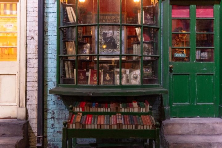 ホグワーツの生徒が教科書を購入する書店の「フローリシュ・アンド・ブロッツ書店」。ショーウィンドウには 魔法界の作家でもあるギルデロイ・ロックハートの写真も飾られています。