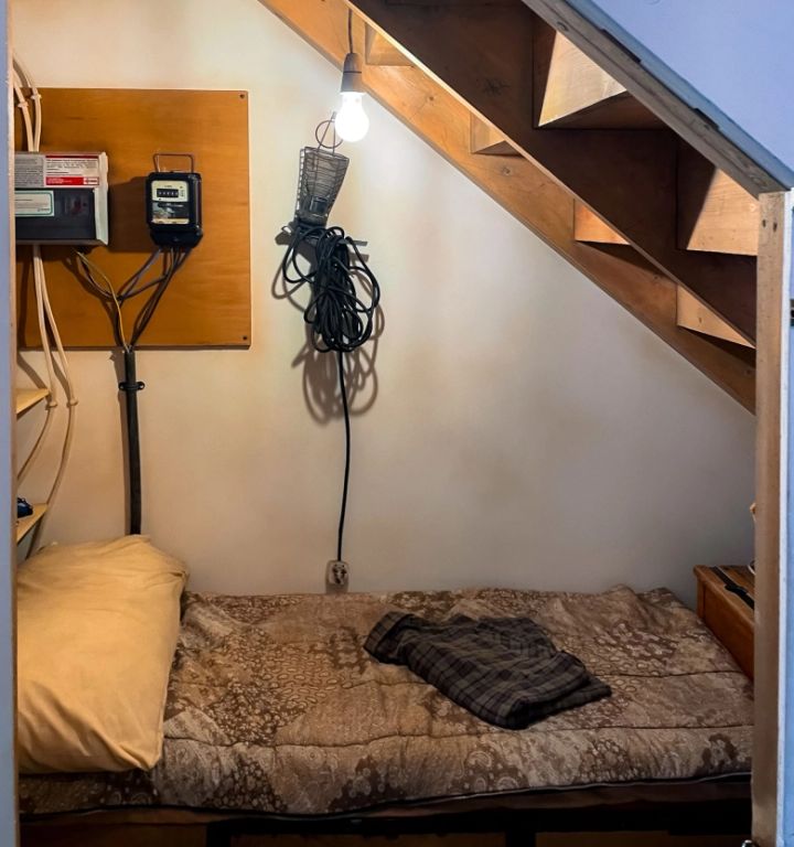 ダーズリー家で不当な扱いを受けていたハリー。階段下の物置が部屋という設定で、ベッドのまわりの配線なども忠実に再現されていました。