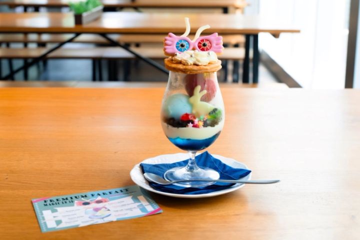 このカフェで話題を集めているのは…登場人物の一人、ルーナ・ラブグッドの象徴的なアイテムであるメラメラメガネをクッキーで、守護霊のウサギをチョコレートで再現したプレミアムパフェシリーズの第二弾!メガネの下にはレモンフレーバーのクリーム、グラスの中にはラムネやラズベリーのシャーベット、チーズクリームなどが入った遊び心抜群のパフェです!
