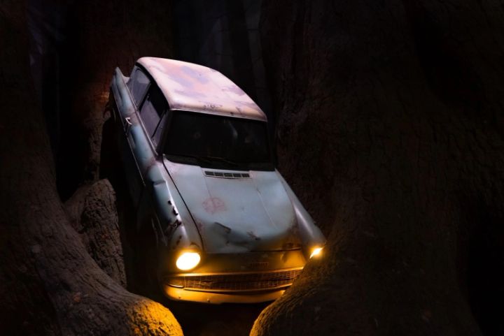 森には空飛ぶフォード・アングリアも!この車は、特撮チームのメンバーによって傷やへこみなどが付けられたのだそう。
