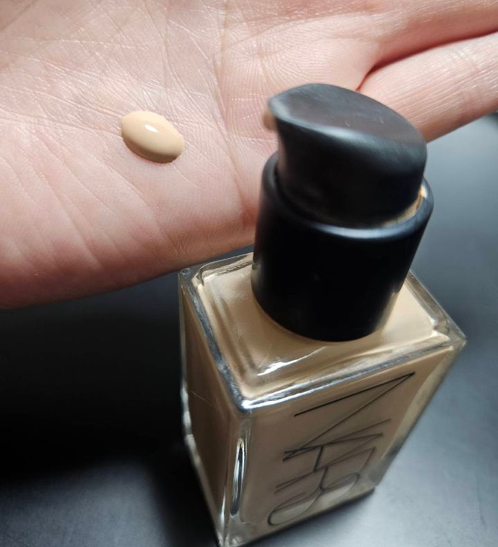 1プッシュでこちら。これでも多いんだってば! ちなみに色は02176というピンクみの強いベージュカラー。本当に、夜中にNARSのこびとがやってきて勝手に足してるんじゃないかってくらい、ファンデーションが減らない。顔デカいのに。