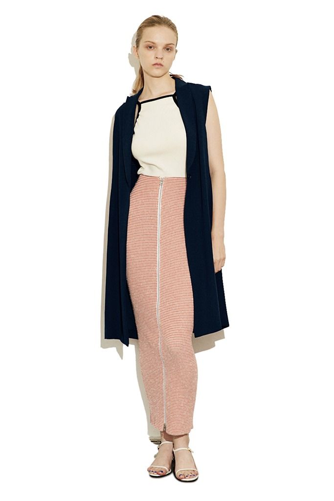 ボディコンシャスな服の体型カバーに、ロングジレを採用。いちばん暗い色を外側に持ってきてロング&リーンにキレを加算。ネイビーなど濃い色を選ぶことで全体が引き締まり、シルエットをゆるめずに華奢な体を想像させられる。