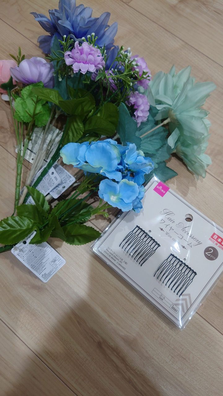 その際に、セリアで購入した髪飾りを使用したのですが、もっと華やかにしたいなぁと思い、100均の造花で髪飾りを作ってみました!