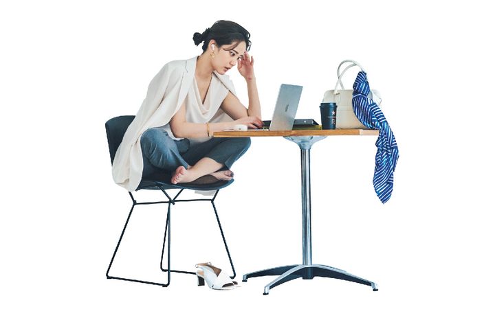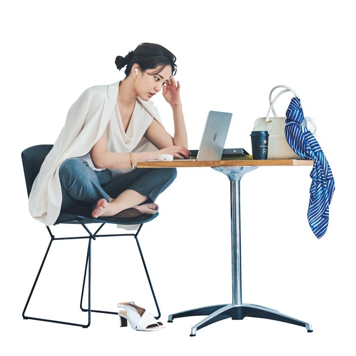 仕事のクオリティが担保されれば自分の働きやすいようにしていい、という職場環境は好き。私含め、椅子であぐらをかきだす人も多数(笑)。ゴールドピアス¥41,580(ソコ/ZUTTOHOLIC)ゴールドバングル¥28,600(ワンエーアールバイウノアエレ/ウノアエレ ジャパン)スカーフ¥18,000(バナナ・リパブリック)サンダル¥71,500(ペリーコ/アマン)バッグ¥209,000(J&M デヴィッドソン/J&M デヴィッドソン カスタマーセンター)
