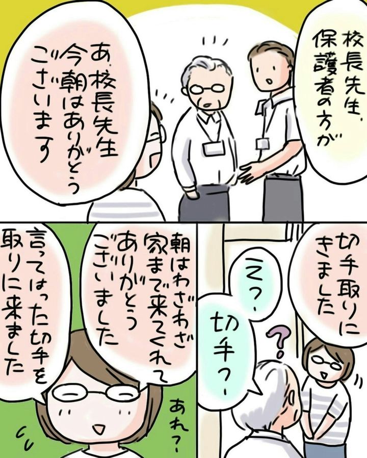 主人公は著者であるあつこさん。この日は10時すぎに校長先生があつこさんの自宅に訪問してきました。なんと、切手を落としたかどうか、わざわざ確認をしにきてくれたのです。
