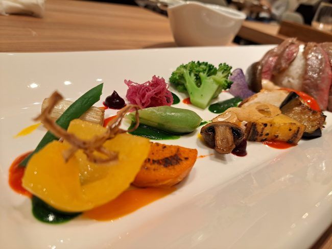 素材の味を引き出すため丸ごと調理した後にカットした野菜と、黄パプリカ・ビーツ・小松菜・ニンジンをピューレ状にしたカラフルなソースが、白いお皿を賑やかに演出しています。