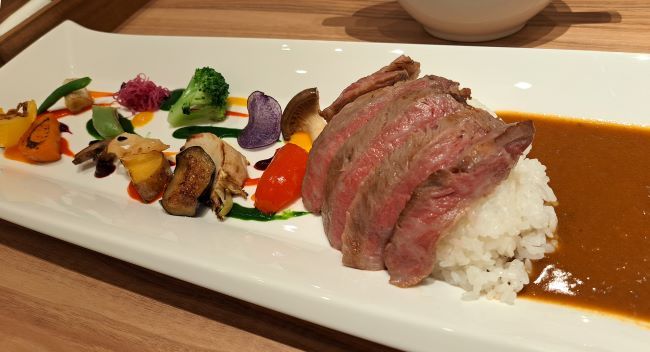 いよいよ試食タイムです。まずは「20種類の野菜摂取! “野菜の遊園地カレー”」が、40cmはありそうな長~いお皿で登場。こちら、ソースやルーも合わせると20種類以上の野菜を使っているそうです。ルーは野菜を長時間煮込むことでとろみを出し、小麦粉の使用は最小限におさえました。トッピングとしてビーフステーキ100g(+1,430円)、ポークフィレカツ(+1,100円)の追加もできます。ライスも白米だけでなく、シーフードピラフ(+330円)、十六穀米(+110円)からチョイスOK。今回はビーフステーキをトッピング!!