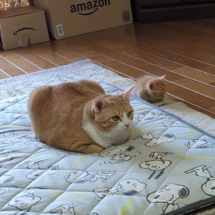 ・きなこちゃんのまん丸具合、真似してるちび助ちゃんのパヤパヤ毛どっちもかわいい。