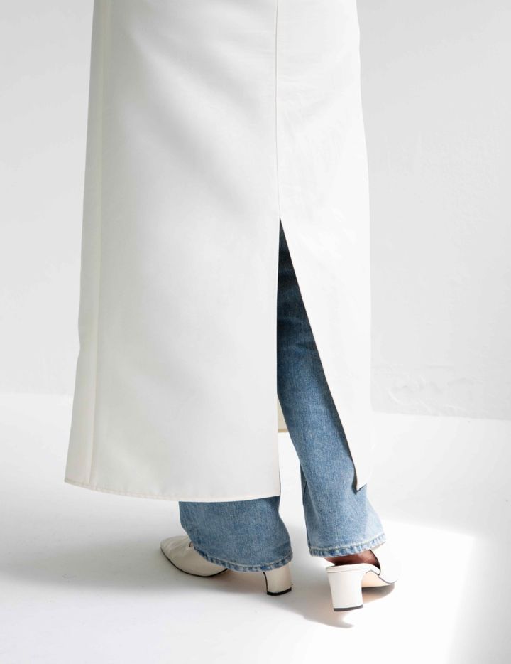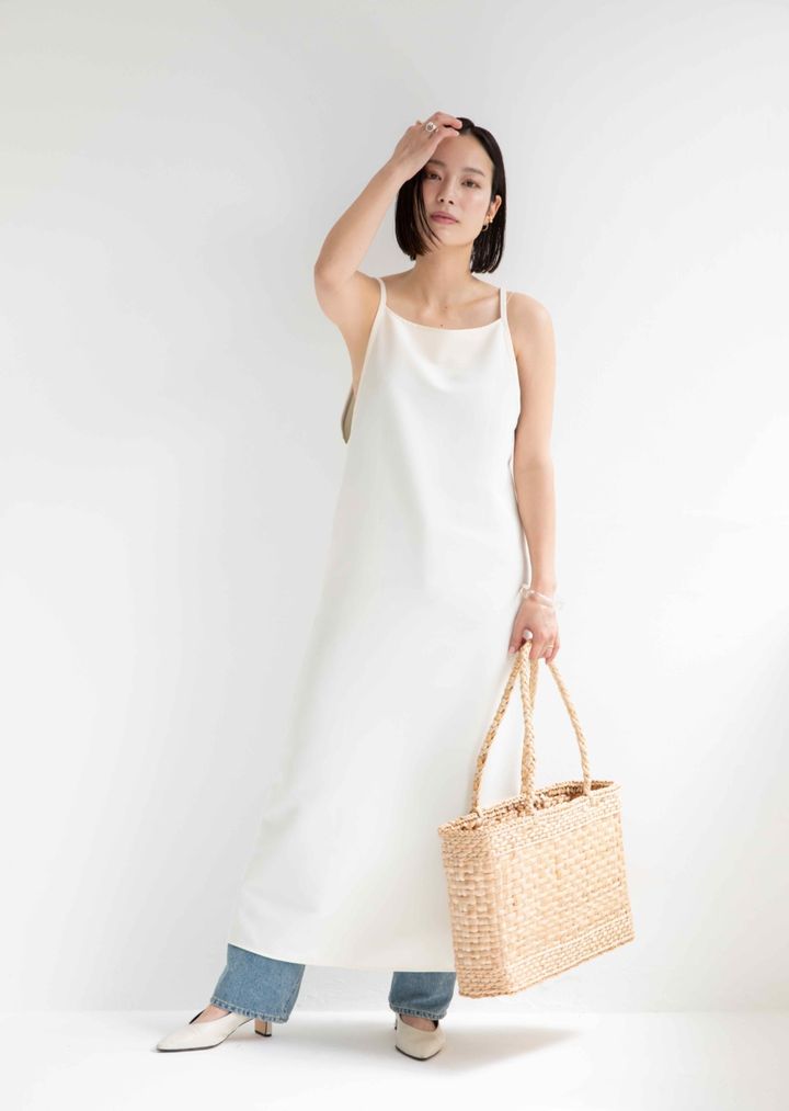 「ホワイトのキャミドレスを主役に、薄色のデニムを重ねて夏らしく爽やかなコーディネートに。足元までホワイトで統一し、上品な印象に仕上げました。コーディネートがシンプルな分、インパクトのあるサイズ&素材感のあるバッグを合わせてアクセントにしています」