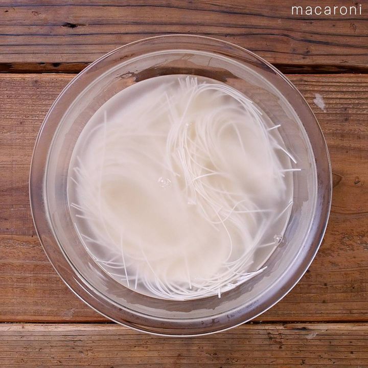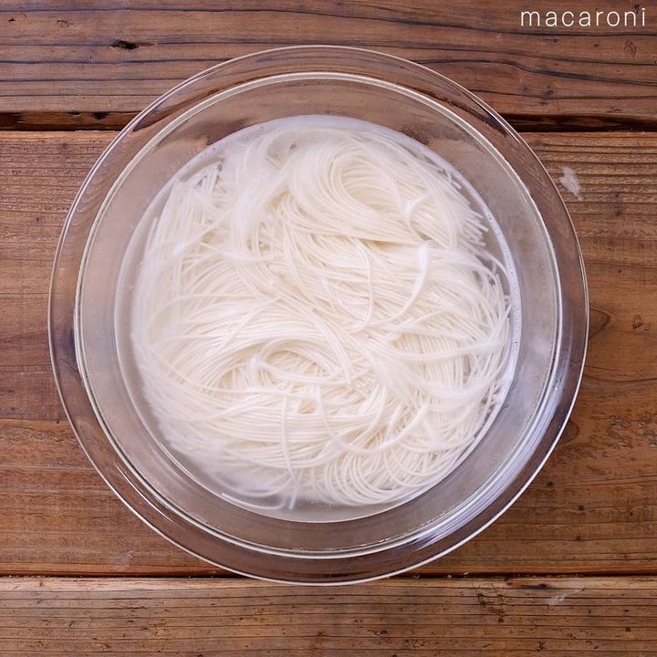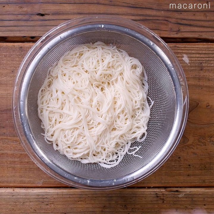 1: そうめんを深めの耐熱ボウルに入れ、熱湯を加えます。