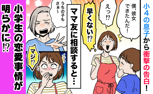 小4の長男から「彼女ができた」と言われ、驚いた私。いつかそんな日がくると覚悟していましたが、まだまだ先だろうと思っていたので、長男には「おめでとう」としか言えませんでした。小学生なのに恋人ができるものなのか戸惑ってしまった私は、違う学校に通っている小6の娘がいるママ友に相談することに。すると、想像以上にドロドロした小学生の恋愛事情が明らかになったのです……。