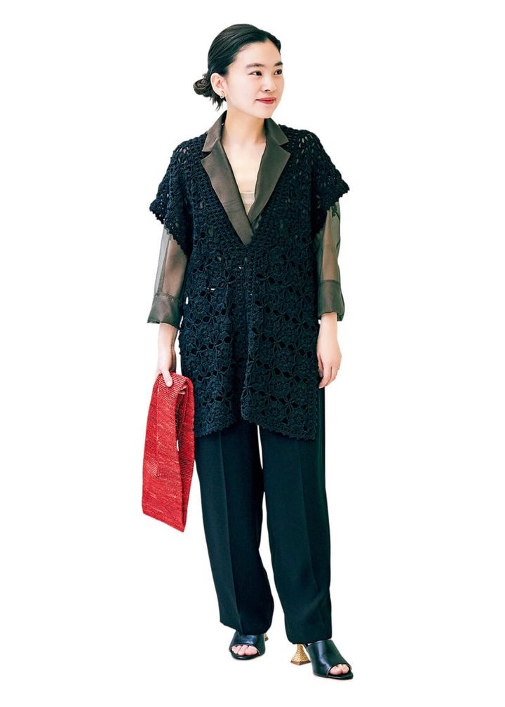 「チュニック丈のクロシェトップスは洒落感をプラスするだけでなく、さりげなく体型カバーにも役立ちます。今回はシアージャケットに重ねて、ジャケットのコンサバ感を適度に抑えカジュアルな印象に。辛口のパンツやスパイシーな小物でモードに寄せました」クロシェトップス¥33,000(マカフィー)、シアージャケット¥36,300(トゥモローランドコレクション)、バッグ¥29,150(セヤ)、サンダル¥52,800(パロマ バルセロ/すべてトゥモローランド)