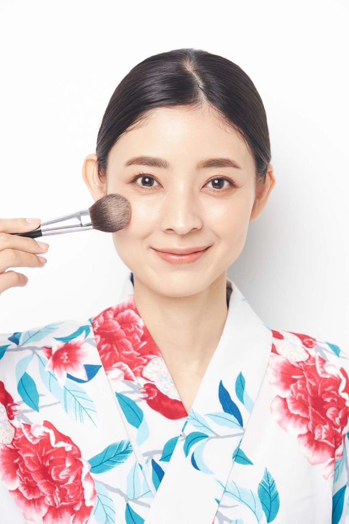 チーク&ハイライトを極めれば、マットな質感のベースに自然なツヤ感をプラスすることができ、より洗練された浴衣メイクに仕上がります。ピンクなど色味の強いチークは、崩れた時にヨレや擦れが目立ちやすいだけでなく、マットでハイカバーなベースに重ねると古臭い印象になってしまうため、浴衣メイクの時には避けた方が無難。浴衣メイクのチークは、顔に〝陰影をつける〟イメージで、できるだけカラーレスで控えめな、肌馴染みの良いベージュ系のチークを選ぶのがおすすめです。