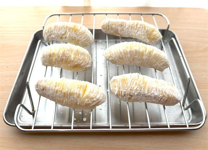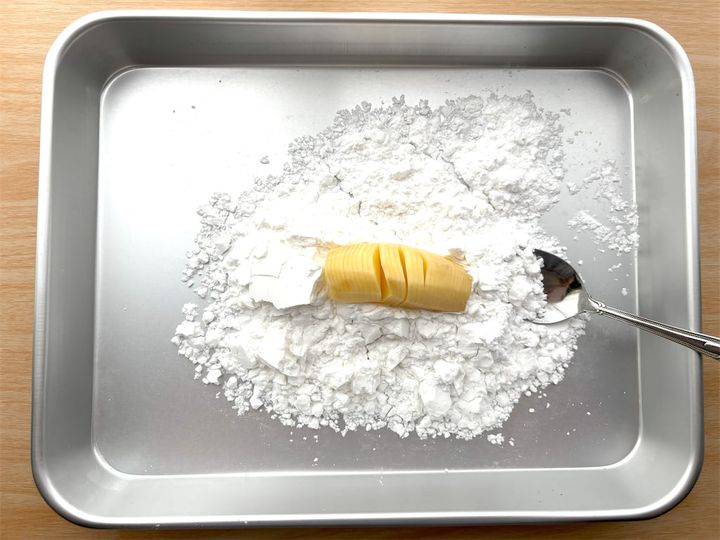 スライスしたじゃがいもの間も忘れずに粉をまぶしてください。