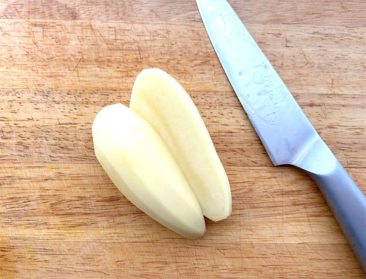 じゃがいもは全て皮を剥き、縦半分に切ります。