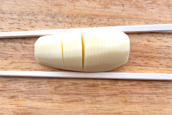 割り箸を置いて、下まで切らないようにしていますが、くれぐれもじゃがいもを下まで切ってしまわないように注意してください。