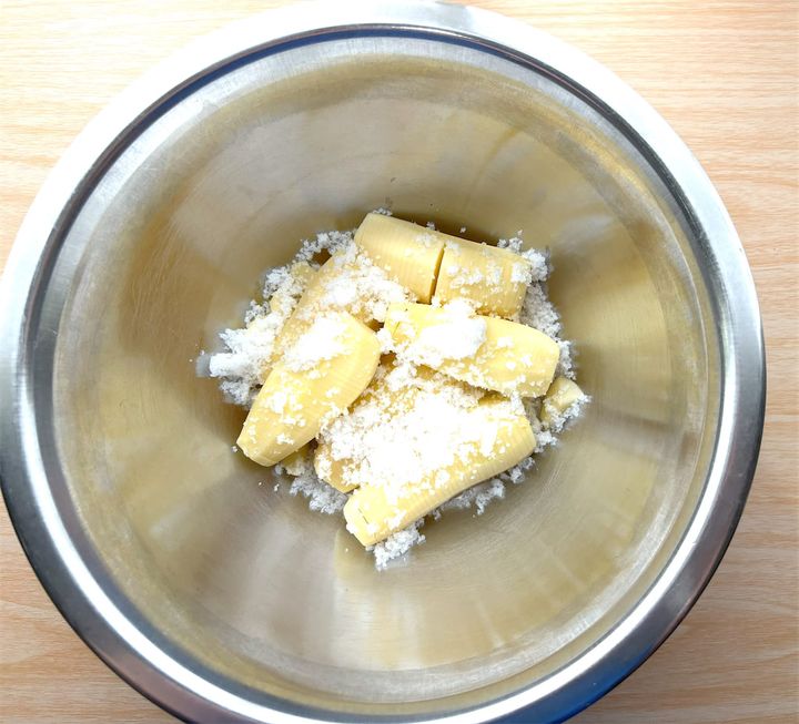 1のじゃがいもは、ボウルに入れて塩を全体にまぶします。