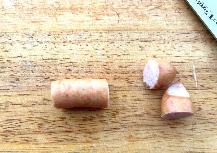 ソーセージは、1で縦半分に切ったじゃがいもと同じくらいの高さになるように切り揃えておきます。