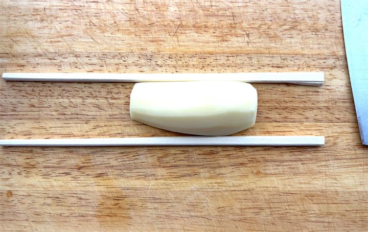 じゃがいもの両脇に割り箸を置き、その状態で数ミリの薄さに切っていきます。