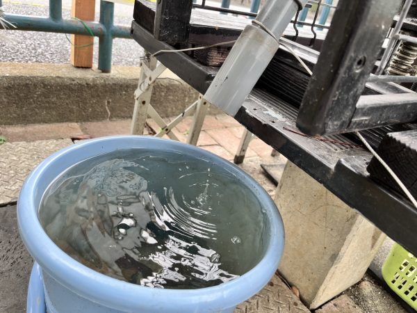 手押しポンプの井戸で、私も少し漕いでみるとちゃんと水が出ました!