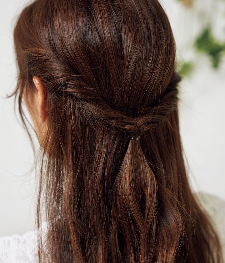 全体をゆるく巻いた後、顔周りの毛を外巻きにねじって、ハーフアップ位置で結びます。後ろ髪を3つにわけ、それぞれ三つ編みにします。ハーフアップの毛先は真ん中の束に。編み目を横に引っ張って崩します。3本の三つ編みを一束に三つ編みにしてサイドにたらしたら完成。