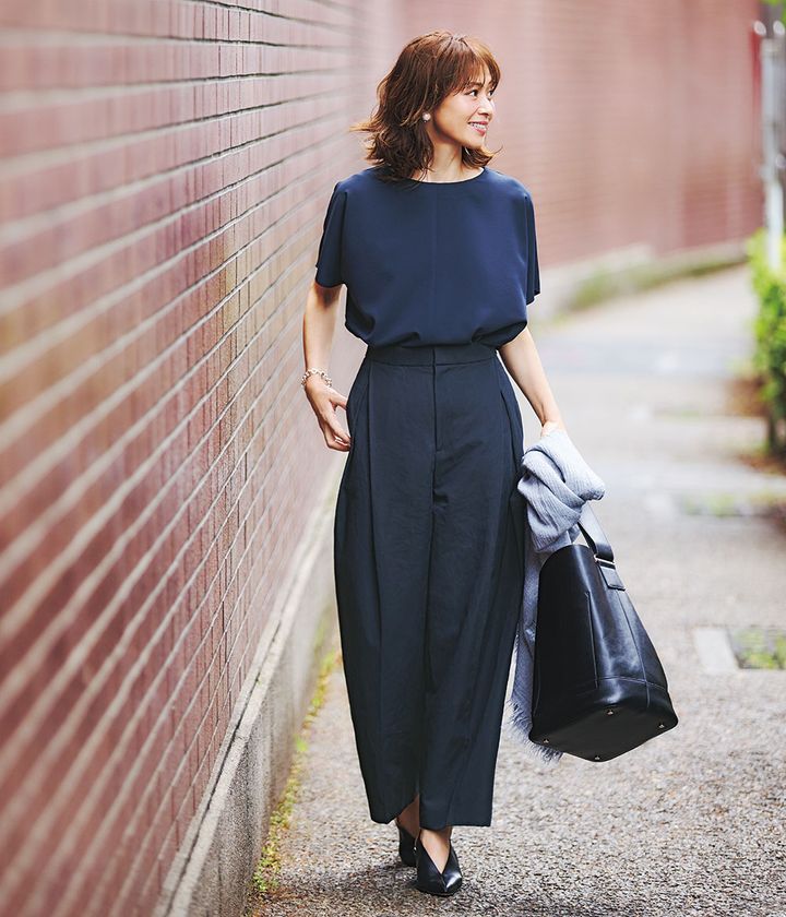 きちんと感があるのに親しみやすいのは、リネンの爽やかさが理由。体が泳ぐゆったりとしたシルエットが爽やかさを醸し出します。モードな黒小物で切れ味をプラス。