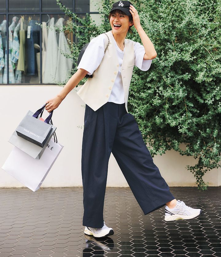 パンツ¥35,200(HOUSE OF LOTUS)Tシャツ ¥8,500(バナナ・リパブリック)ベスト ¥18,920(ネイヴ)バッグ ¥79,200(ロンシャン/ロンシャン・ジャパン)スニーカー ¥15,400(アシックス/アシックスジャパン)キャップ ¥4,400(ニューエラ)