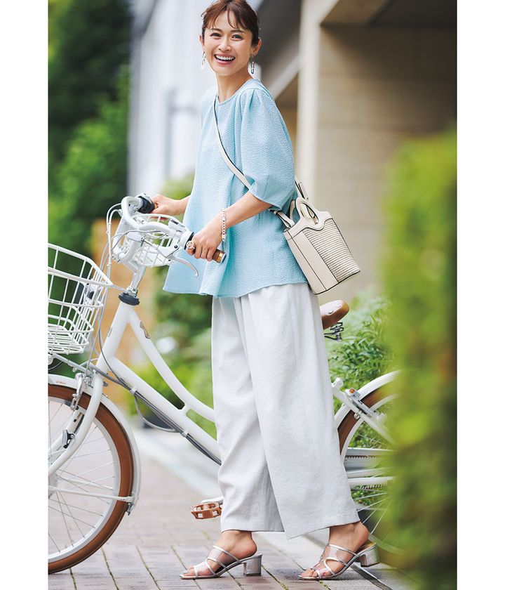 パンツ ¥16,500(N.O.R.C)ブラウス ¥4,950(OPAQUE.CLIP)バッグ ¥8,690(カシュカシュ/アンビリオン)サンダル ¥35,200(ファビオ ルスコーニ/ファビオ ルスコーニ ジェイアール名古屋タカシマヤ店)ピアス ¥11,000ブレスレット ¥23,100(ともにワンエーアールバイウノアエレ/ウノアエレ ジャパン)リング ¥23,320(バルブス/ZUTTOHOLIC)