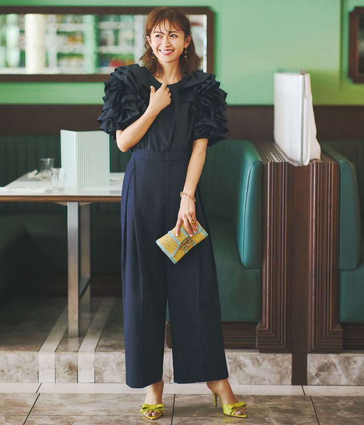 ウキウキする気持ちは甘ディテールに託して、配色は都会的に。盛りブラウスはマニッシュなパンツで受け止めるのが今の気分。