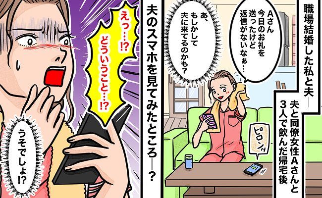 社内恋愛を経て、結婚した私たち夫婦。同僚の女性と夫の3人で飲みに行って帰宅後、同僚にお礼のメッセージを送ったのですが、返信はありませんでした。もしかしたら夫のスマホの方に連絡が来ているかもしれないと思った私は、夫の携帯を見てみることに。