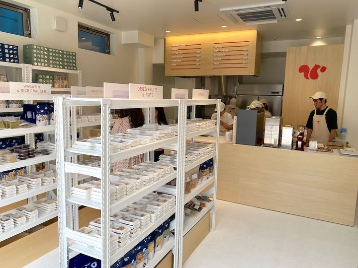 店内はスナックミーの赤色を控えめにして、白を基調とした清潔感のある空間です。注文カウンターとカフェスペース、物販スペースで構成され、スタンド形式である蔵前店に比べると総面積が約2倍で広々としています。