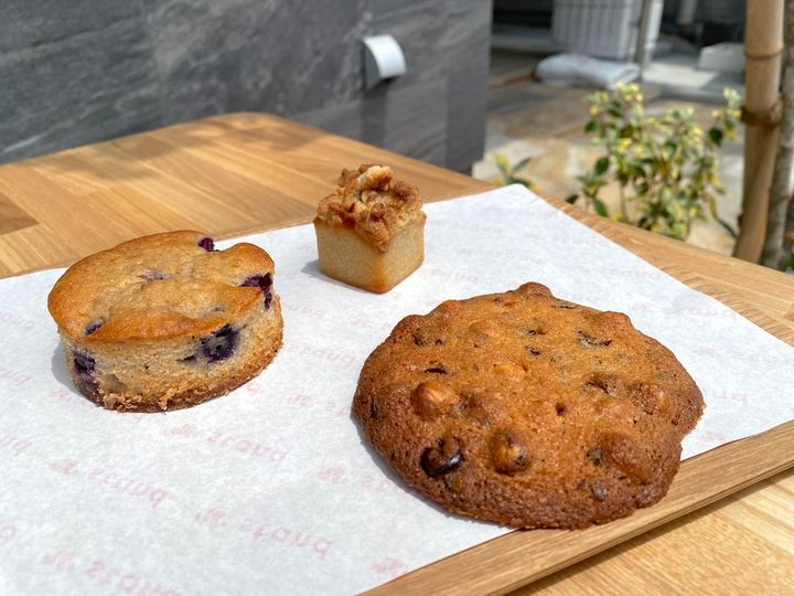 また、「snaq.me stand 押上店」では、サブスクでは食べられない限定焼き菓子も販売しています。ラインナップは時期によって変わる予定で、取材時には「フィナンシェケーキ あんバター」330円、「アメリカンクッキー」390円、「ブルーベリーケーキ」490円の3種類が揃っていました。すべてお店で焼き上げたものなので香ばしい香りを感じられて◎。