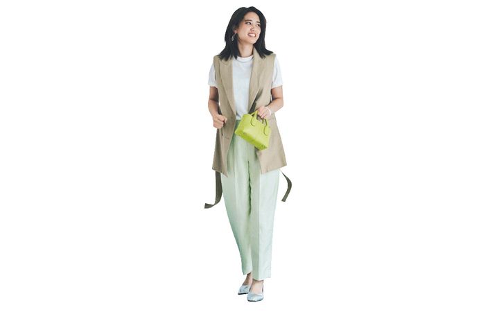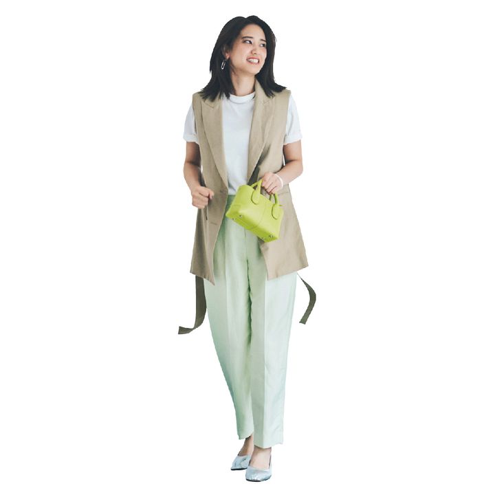 派手すぎず、通勤にもマッチする爽やかなライム。パンツ¥17,000(バナナ・リパブリック)