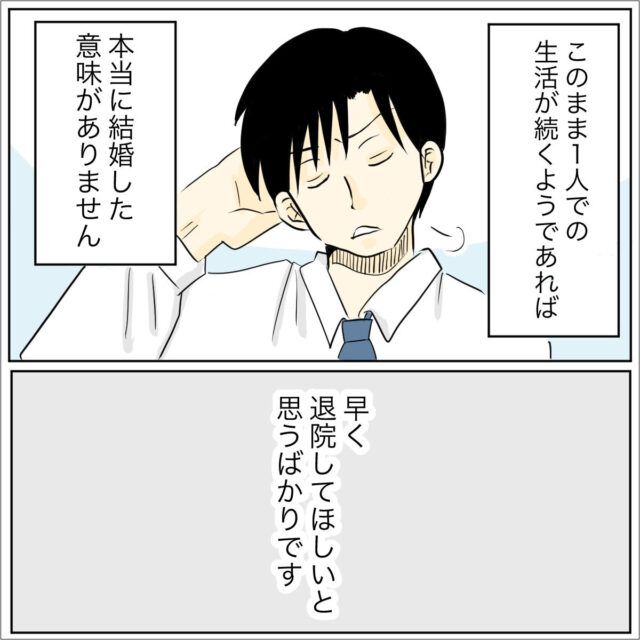 自分が考えたスケジュール通りに生活がしたい夫タクマさんのために、妻カナコさんは妊娠してつわりが酷くてもできる限りは頑張っていましたが、思うようにからだが動かなくなり、タクマさんに与えられた家事や生活サポート全てをこなすことが出来なくなって、ついソファで寝落ちしてしまうこともありました。毎日気持ち悪くて動けないことがタクマさんにはわかってもらえず、1日のタスクがこなせないと不満をあらわにするようになってしばらく経ち、カナコさんは食事が摂れなくなって体重がかなり落ちたことで入院してしまいました。カナコさんのからだとお腹の赤ちゃんを心配するタクマさんはカナコさんがどれだけご飯を食べたのかを毎日病院を訪れて確認していました。