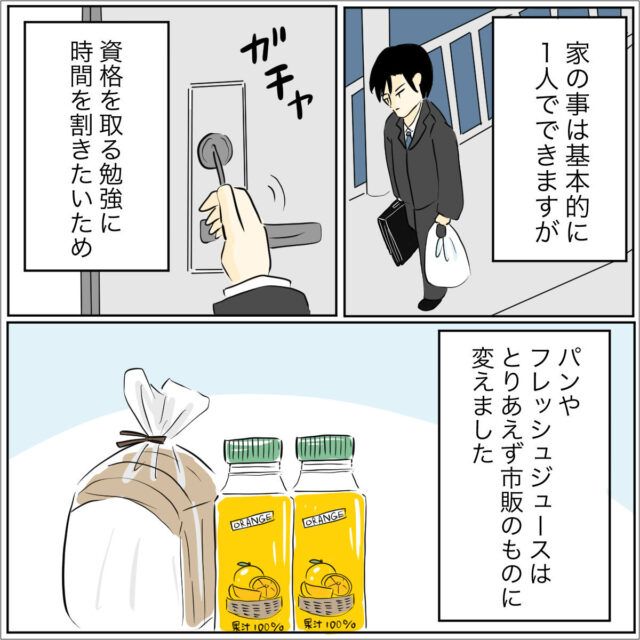 家のことは基本的に1人でできますが、資格を取る勉強に時間を割きたいためパンやフレッシュジュースはとりあえず市販のものに変えました。