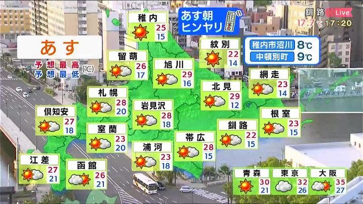 各地で晴れますが、朝は道北や道東方面で気温が下がり、稚内の沼川は8度、同じ宗谷の中頓別町では9度まで下がるでしょう。