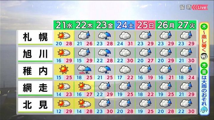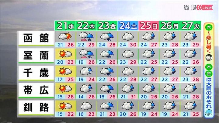 木曜の夜から道南で雨脚が強まり、金曜日にかけて雨の降り方に注意して下さい。週末は寝苦しさも戻ってきて、函館の最低気温は24度くらいでしょう。