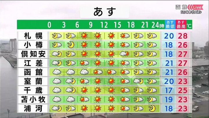 背景は20日午後5時20分ごろの函館情報カメラ。函館は20日は雨具が必要になりましたが、あす21日は日傘が活躍します