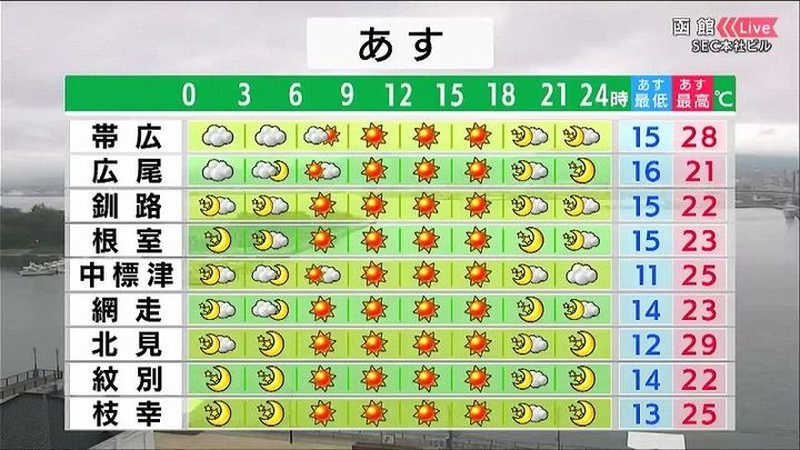 晴れて、紫外線対策が必要です。中標津や北見など朝と日中の気温差が15度くらい開くので、服装調節に気を付けてください。