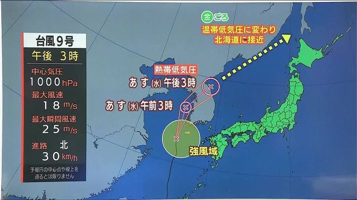 東シナ海を北上中の台風9号は、あす21日に朝鮮半島を通ります。そして台風から変わった低気圧が23日(金)にかけて北海道に近づき、大雨になるおそれがあります。