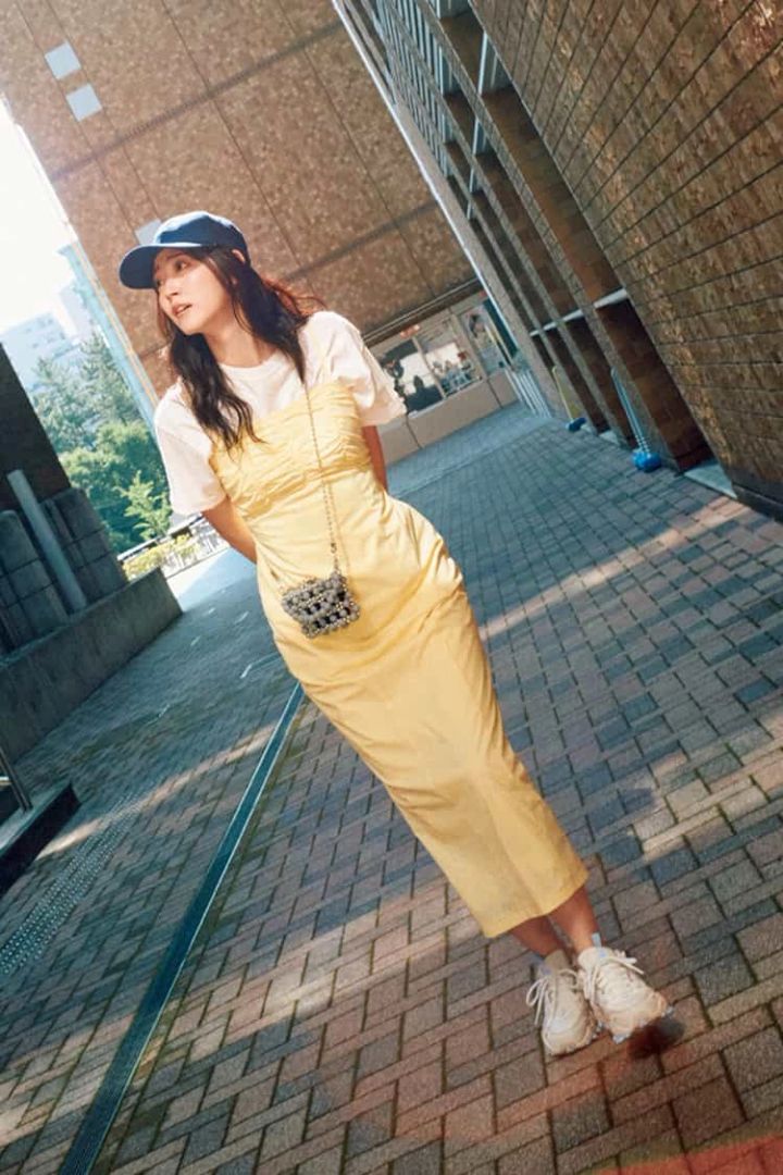 ほどよくタイトなキャミワンピをあわせて女みアピール♡ 小物は、キャップやスニーカーなどカジュアルなアイテムで統一!