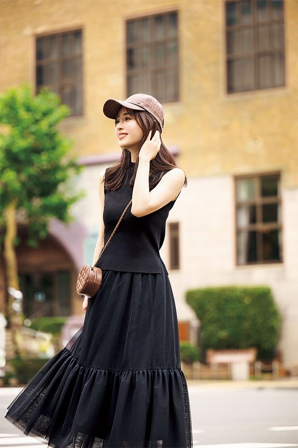 帽子¥11,000/ランバン オン ブルー(オーロラ) ニット¥11,000/イチエ(シュガー・マトリックス) スカート¥33,000/グレースコンチネンタル(グレースコンチネンタル 代官山本店) バッグ¥2,790/神戸レタス