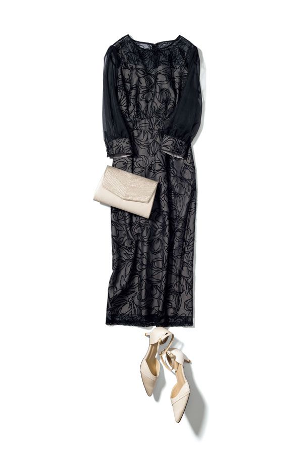 黒でもレース使いやデコラティブなデザインで華やかなものを選んだり、小物やバッグや靴で黒以外を選ぶ工夫をしましょう。ロング丈でも問題ありません。