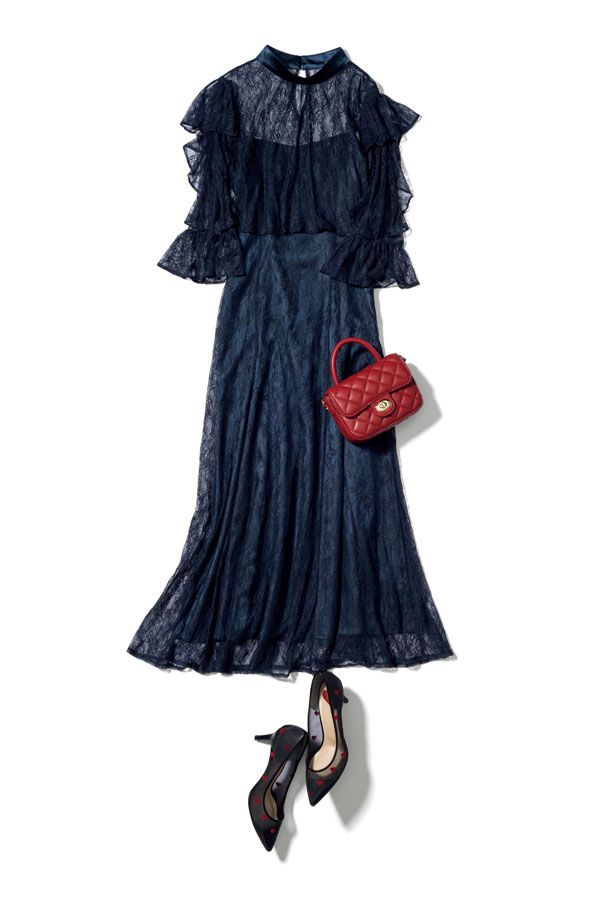 デコルテの透け感や袖のレース使いがフェミニンで、特別感たっぷり。パンプスにも赤を取り入れてさりげなくリンクさせ ると統一感も高まります。