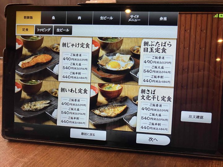 朝のメニューはどれも、定食とは思えないほどのお値段。私は朝さば文化干し定食、夫は朝ぶたばら目玉定食(どちらも539円)を注文させていただきました。ボリュームもたっぷりで、大満足の朝ごはんとなりました。