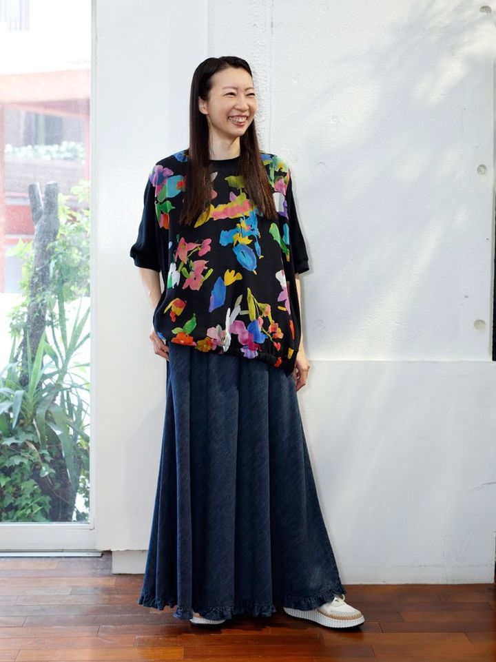 柄物を大胆に取り入れたスタイリングが得意な小林さん。「ハク」のドルマンカットソーに、デニムのロングスカートを合わせたリラックススタイルがお似合いです。スカートの裾にあしらわれたフリルで甘さをプラスしつつ、足元はスニーカーでカジュアルに。